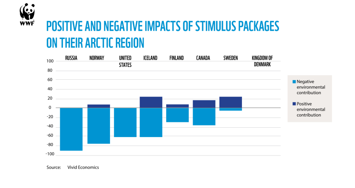 The report examines the COVID-19 stimulus packages for each of the eight Arctic countries and finds that overall, the stimulus will have a negative environmental impact on the Arctic. For instance, policies that encourage increased investments in oil and gas activities will escalate risks from climate change and cause long-term environmental harm. Sweden is the only country with COVID-19 stimulus that will have a net positive Arctic environmental impact. And their set of measures also has the greatest potential to create green jobs in the region.