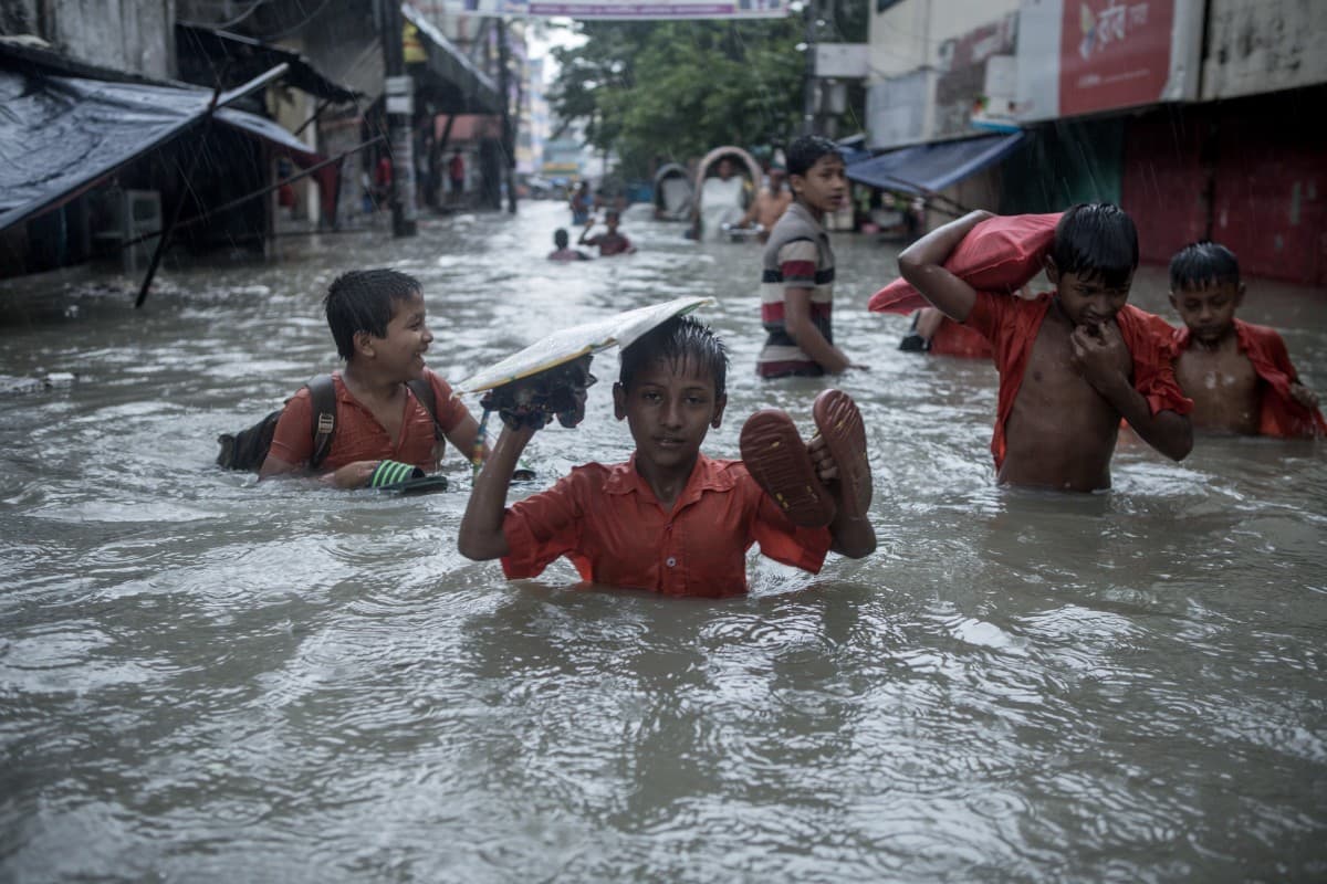 Students of a local school wade through chest-deep water on a flooded street, during a tidal surge. This photograph is by Jashim Salam, a local photographer, who has taken it upon himself to document the devastating realities of living with floods. “I remember the tidal surges started happening in Chittagong from 2009, when sudden floods would happen in my neighbourhood. Before this, there was no flooding in the city.