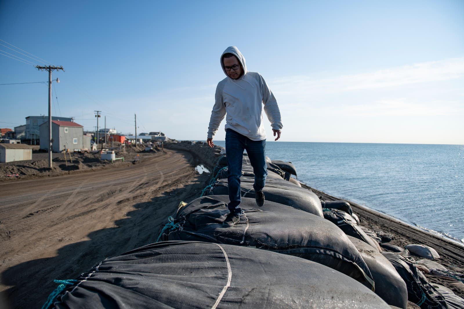 Eben W. Hopson looks out over the Chuckchi Sea from a pile of sand bags meant to stop shoreline erosion in Utqiagvik, Alaska. Even though it is July, there should still be sea ice floating on the water, but there is nothing except the calm surface of the ocean.