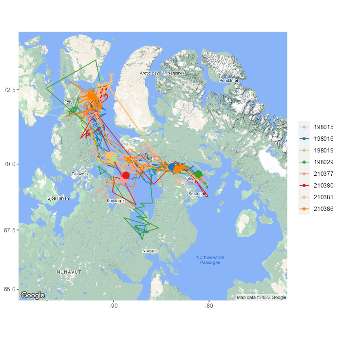 Special thanks to Foxe Basin bowhead field research team in Igloolik that deployed satellite tags onto the whales, collected photographs both from the air and boat and sampled the whales using biopsy techniques along the floe edge in June-July 2022: Cory Matthews, Justine Hudson, Tommy Pontbriand, Todd King Ammaaq, Levi Qaunaq, Travis Qaunaq, and Morgan Martin. This project is managed by Brent Young and Steven Ferguson of Fisheries and Oceans Canada, Winnipeg. A big thank you to the Igloolik Hunters and Trappers Association, in particular the manager Jacob Maliki, for their support and assistance. Thank you as well to our Inuit colleagues based in Igloolik and Sanirayak, and to everyone who helped with truck rentals and moving gear. Financial support was provided by Fisheries and Oceans Canada and the Nunavut Wildlife Management Board.