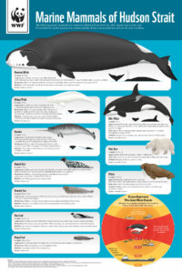 The Hudson Strait Mariner’s Guide is made up of two large posters to be hung on the ship’s bridge: a chart that will help mariner’s identify whales, seals, polar bears and walrus, and maps of marine mammal habitat in both summer and winter. The guide lists phone numbers so mariners can report sightings and incidents at both the national and community level, and provides operational guidance when close to or encountering marine mammals.
