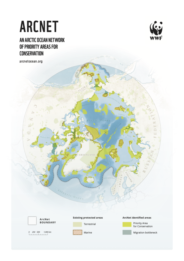 In response to slow progress to reaching global biodiversity goals and the Arctic Council’s 2015 framework for a pan-Arctic network of marine protected areas, WWF initiated the development of ArcNet in 2017. ArcNet convened marine experts from five coastal Arctic nations for an unprecedented scientific analysis to establish a blueprint for a comprehensive network across the Arctic Ocean as the crucial first step toward broader ocean-scale conservation efforts.