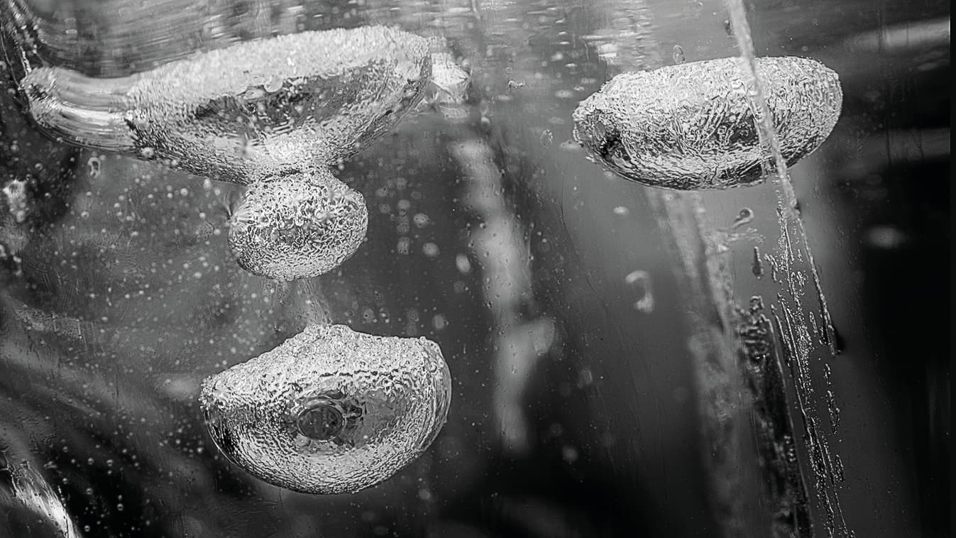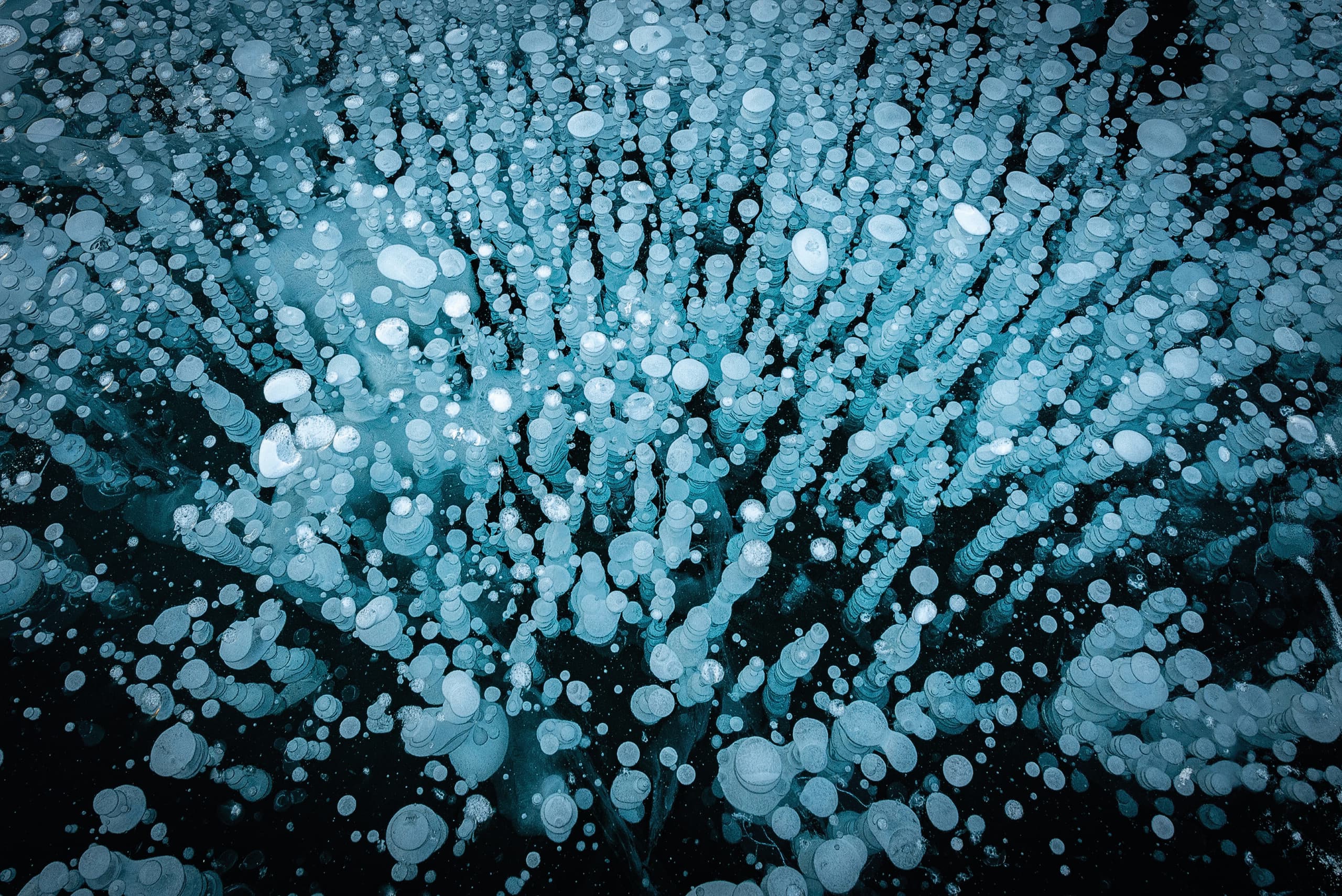 Photo: This photo of methane bubbles frozen in Lake Abraham, Alberta, Canada, shows the structure of the bubbles in ice.