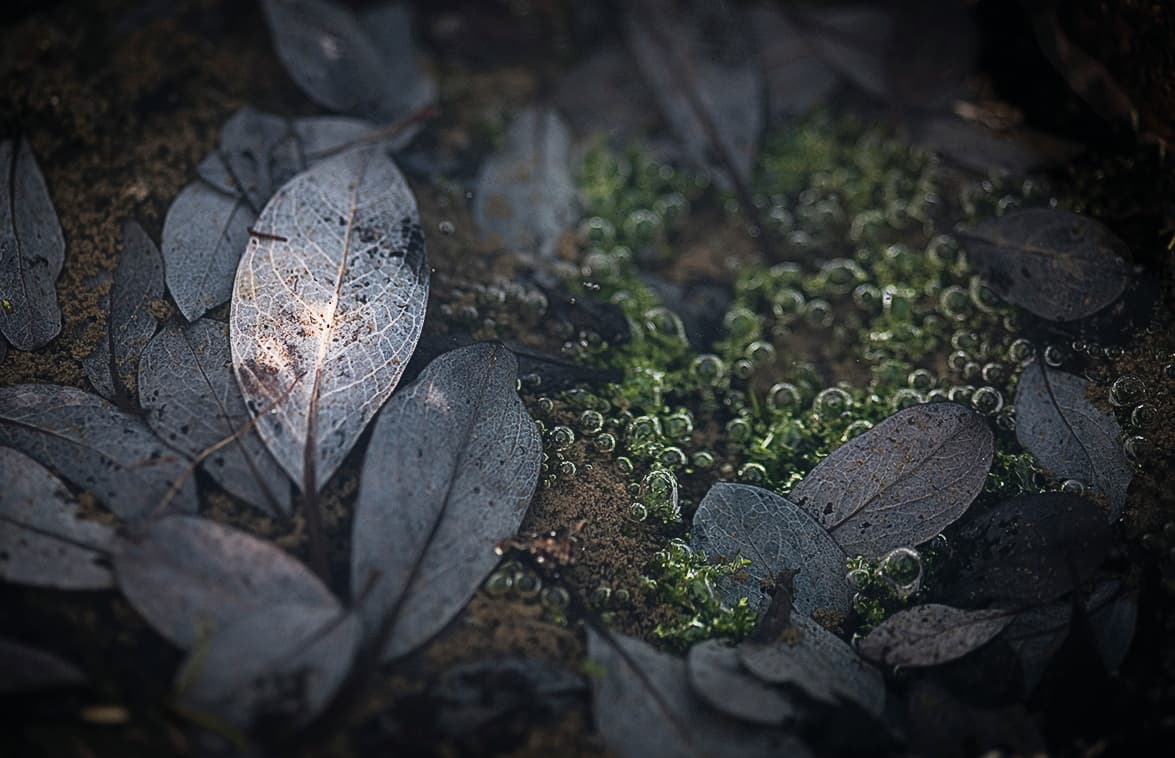 Photo: Tiny methane bubbles with autumn leaves and algae in Scoresbysund, Bear Island, eastern Greenland.