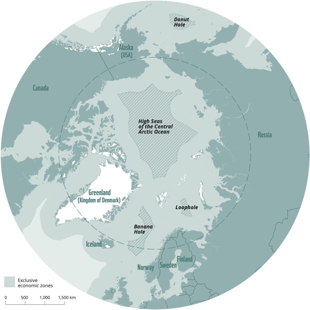 There are four pockets of high seas in the Arctic Ocean: the “Banana Hole” in the Norwegian Sea, the “Loophole” in the Barents Sea, the “Donut Hole“ in the Bering Sea, and the high seas portion of the central Arctic Ocean. Map design: Ketill Berger, filmform.no. © WWF WWF Global Arctic Programme