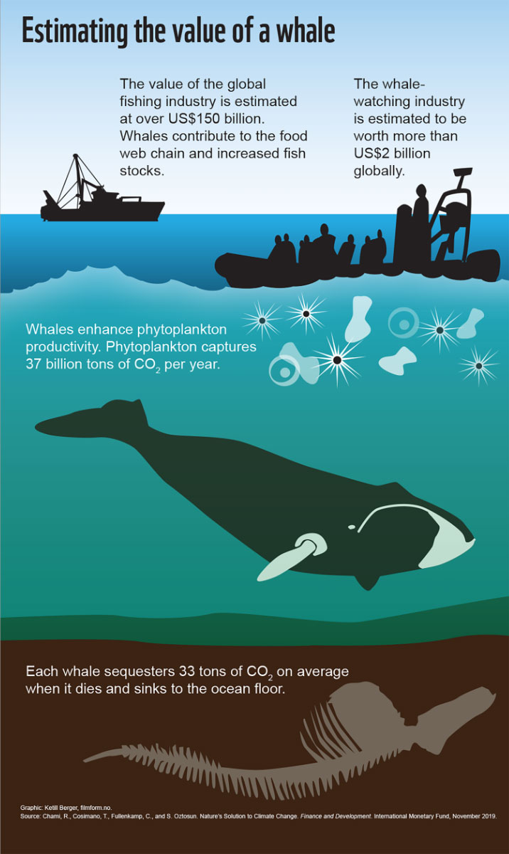 International Monetary Fund (IMF) researchers estimate that whales are worth $2 million US each to the planet because of their tremendous ability to sequester carbon.