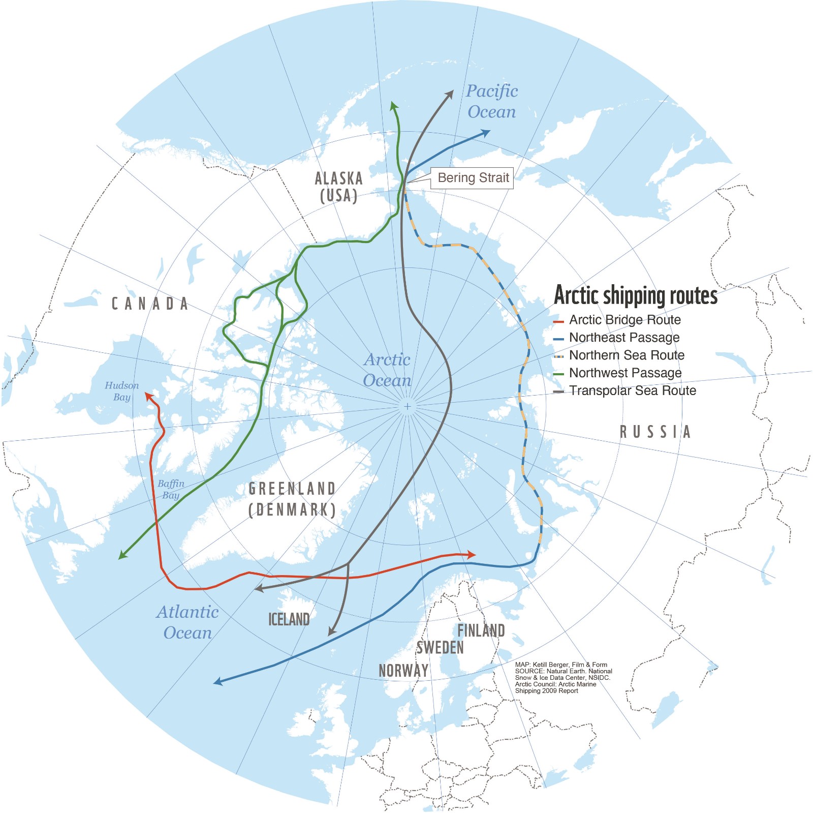 According to a recent report by the Arctic Council, the number of ships entering Arctic waters grew by 25 per cent between 2013 and 2019 while distance sailed jumped by 75 per cent. In addition to existing routes, which will see higher volumes of ship traffic, the Arctic Ocean—once transformed by the climate crisis—could host as many as four new trans-Arctic shipping routes: the Northeast Passage (including the Northern Sea Route), Northwest Passage, Transpolar Sea Route and Arctic Bridge. All offer the appeal of much shorter distances than the two routes that currently connect the Atlantic to the Pacific Ocean (the Panama Canal) and the Indian Ocean (the Suez Canal).