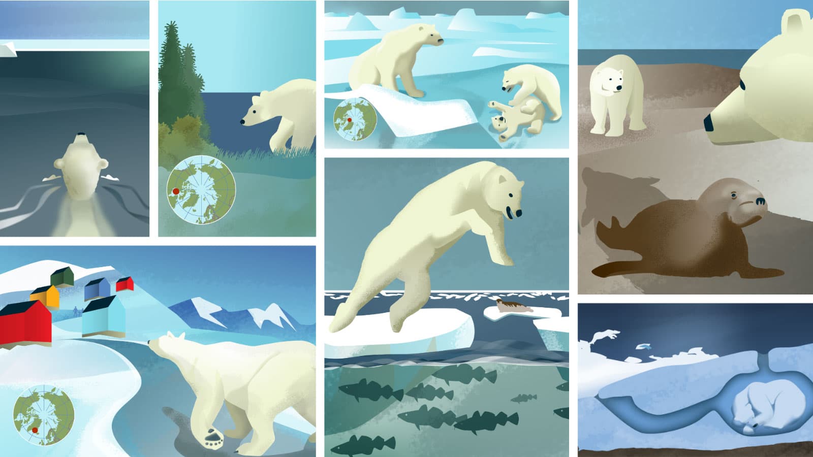 Less Arctic sea ice affects polar bears in many ways, including changes to bears’ physical condition, behaviours and survival rates.